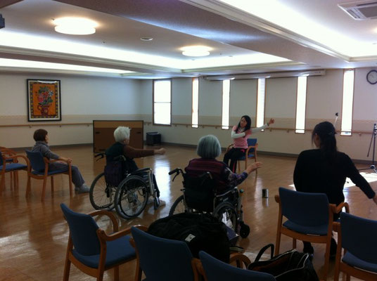 椅子や車椅子に座って、体を動かヨガをして頂きました。吐く呼吸を意識していただけるよう時々声をだして頂きました。