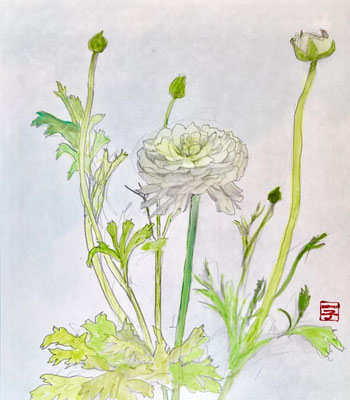 白い花ですが、花びらの濃淡を三原色で丁寧に混色し彩色できました。