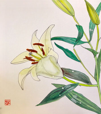 白の百合の花の色味や、質感の表現が三原色でうまく描けました。