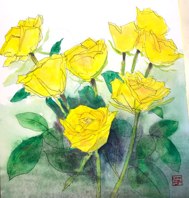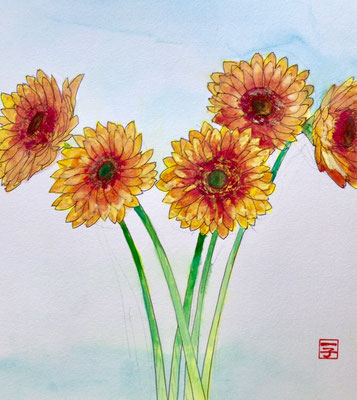 三原色(青・赤・黄色のみ)の透明水彩を使用して季節の花を描いてみましょう。 |