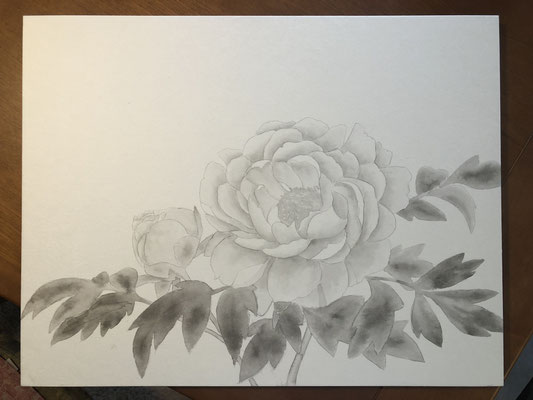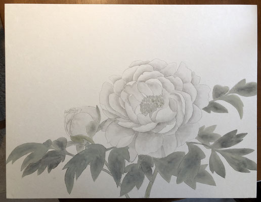 転写をし、葉や花と順番に墨入れ、下塗りをしています。