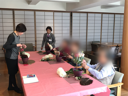 色とりどりの花を、思い思いにアレンジして春を感じていただきました。