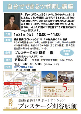 1月21日 プレステージ刈谷駅前様にて「自分でできるツボ押し講座」を開催しました。